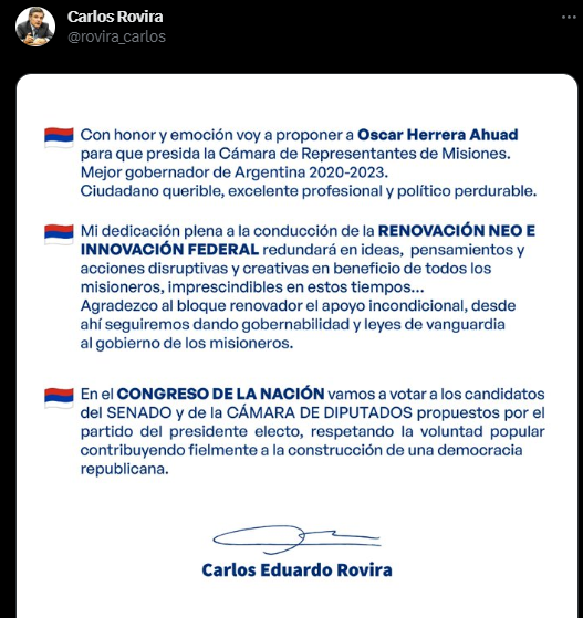 A través de sus redes sociales, el actual presidente de la Legislatura provincial, Carlos Rovira, propuso al gobernador Oscar Herrera Ahuad para presidir la Cámara de Representantes. Además, elogió la gestión del mandatario al frente de la provincia como el “mejor gobernador de Argentina 2020-2023“. De esta manera, “con honor y emoción”, el conductor del Frente Renovador de la Concordia calificó a Herrera Ahuad como un “ciudadano querible, excelente profesional y político perdurable“.