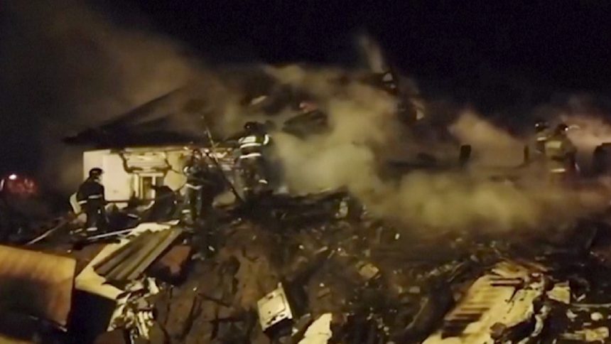 Al menos una decena de bomberos lanzaban agua contra la vivienda, parcialmente destruida, según un video publicado por Kobzev.