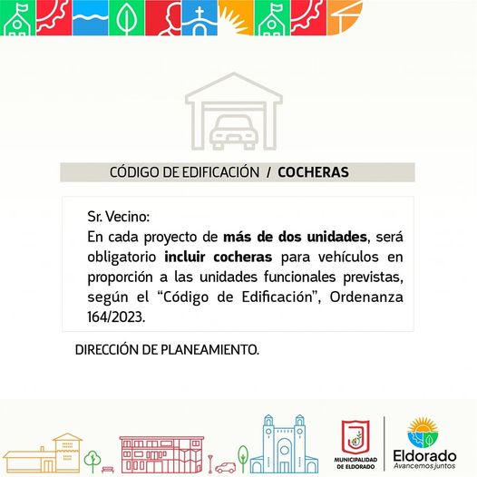 La Dirección de Planeamiento de la Municipalidad de Eldorado informa que «en cada proyecto de más de dos unidades, será obligatorio incluir cocheras para vehículos en proporción a las unidades funcionales previstas», según el «Código de Edificación», Ordenanza 164/2023.
