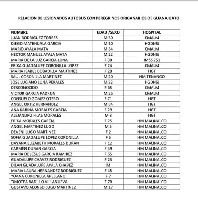 Por su parte, la Dirección de Protección Civil de San Luis de la Paz, de donde son originarias las víctimas, señaló en redes sociales que se encuentra en coordinación con las autoridades del Estado de México a fin de mantener informadas a las familias de las personas accidentadas; hasta el momento, medios locales difundieron una lista preliminar de los lesionados y los hospitales a donde fueron trasladados: