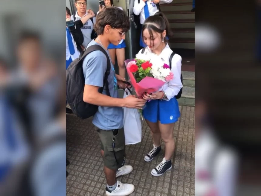 Una alumna de la Escuela Superior de Comercio Nº 6 “Mariano Moreno”, de la ciudad de Posadas, se llevó una romántica sorpresa a la salida del colegio cuando su novio la esperaba con un ramo de flores en brazos.